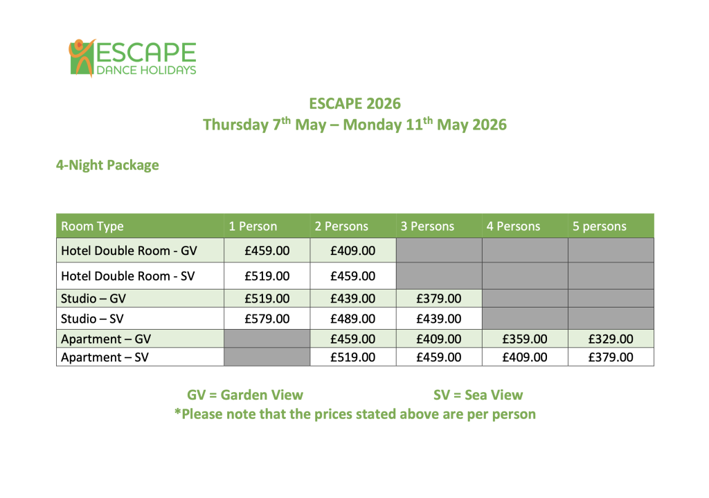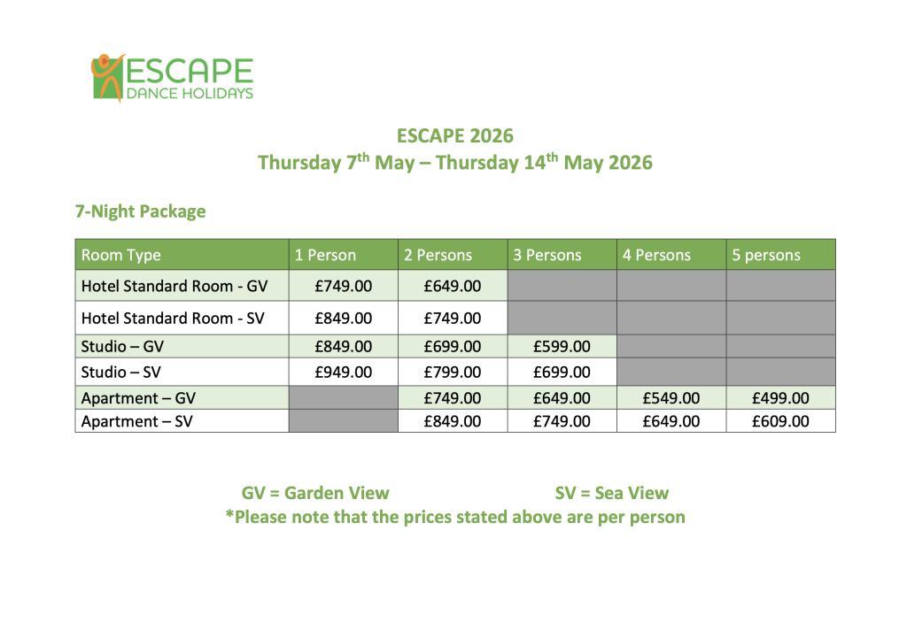 The Full ESCAPE Package (7-nights: Thursday 7th – Thursday 14th May 2026) includes accommodation, breakfast, transfers*, full dance programme of classes, Impact Dance’s entertainment and official ESCAPE t-shirt